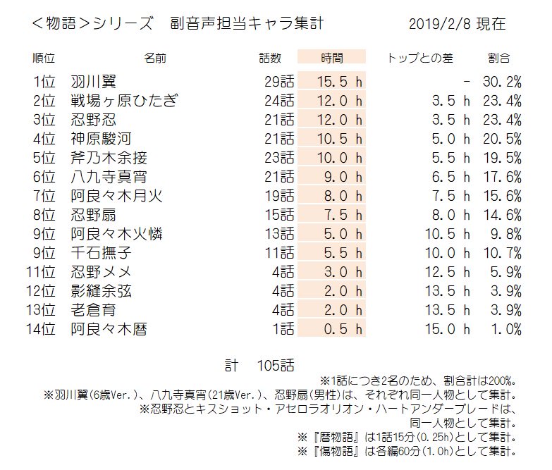 小庵 春 続 終物語 の副音声担当キャラが発表されましたので ランキングを集計し直しました 話数ではなく 担当時間でランキングしています 副音声クイーン羽川さん いまだ3割をキープ なお主人公は Ry 物語シリーズ 続終物語 T Co